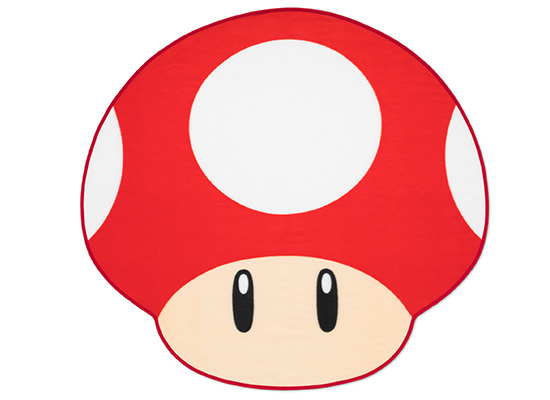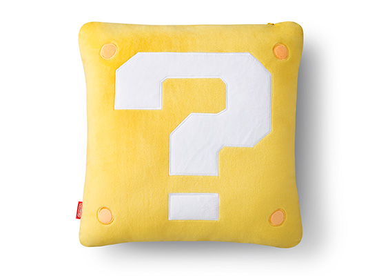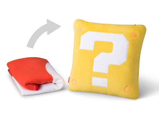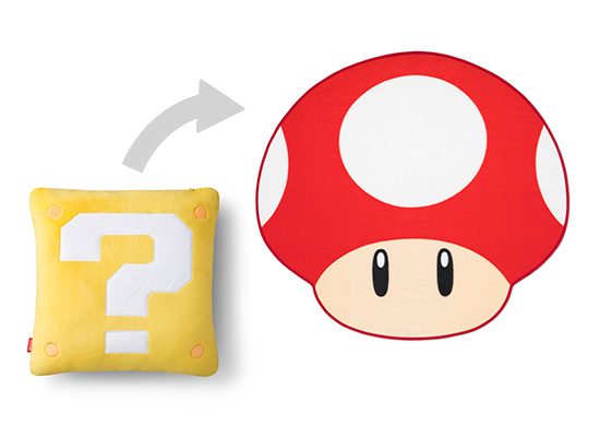 「ハテナブロック」のクッションと「スーパーキノコ」のミニブランケットのセットです。クッションの中にブランケットが入っています。 クッションはミニブランケットを取り出した後もボリューム感たっぷり。