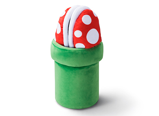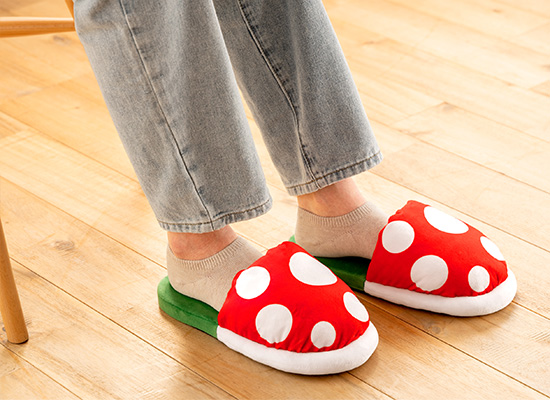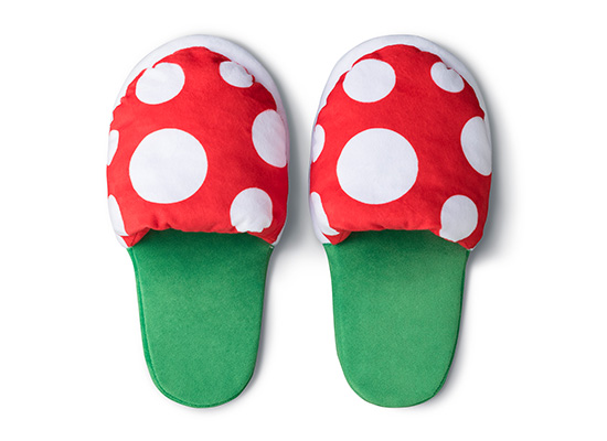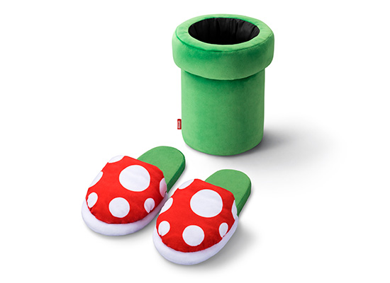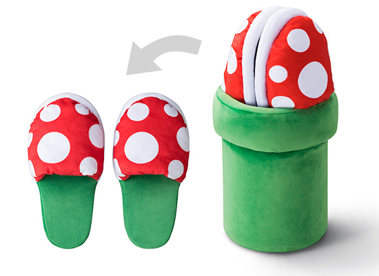 スリッパを立てて「土管」に収納できる「パックンフラワー」のスリッパセットです。 土管の中からパックンフラワーが出てくるシーンを再現しています。