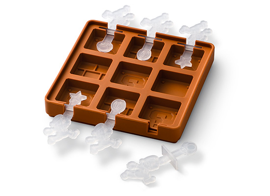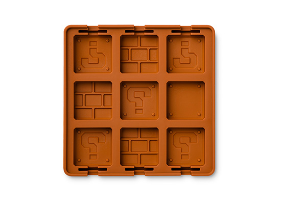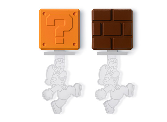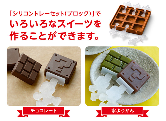 ブロック型のチョコレートやシャーベットが作れるシリコントレーと「マリオ」がジャンプしてアイテム(「スーパースター」「コイン」「スーパーキノコ」)を取る姿を再現したスティックのセットです。 「ブロック」からアイテムが出てくるときのワクワク感を味わうことができます。