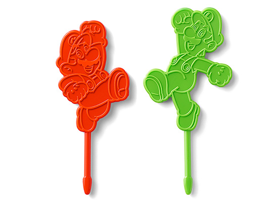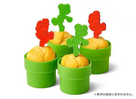 焼き菓子が作れる土管型のマフィンカップ4個と、マリオ型ピック2本、ルイージ型ピック2本のセットです。