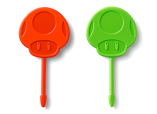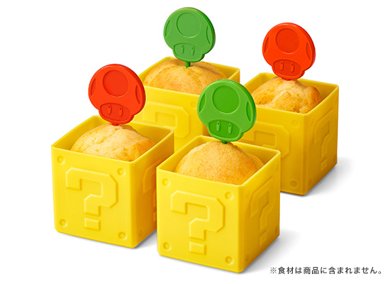 焼き菓子が作れるハテナブロック型のマフィンカップ4個と、スーパーキノコ型ピック2本、1UPキノコ型ピック2本のセットです。