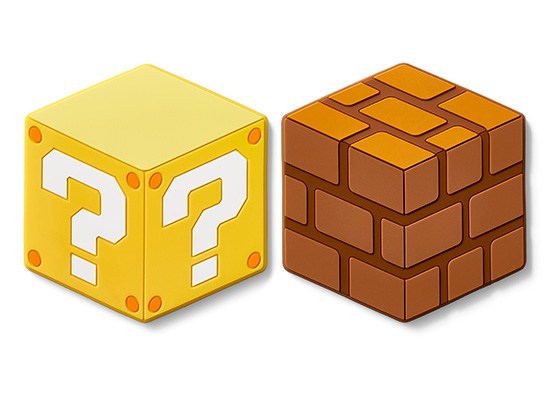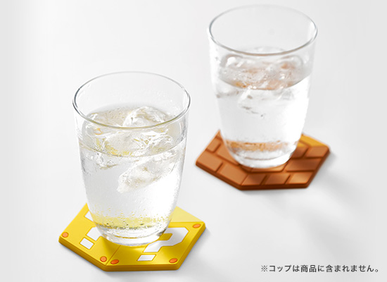 ハテナブロックとブロックをかたどったシリコンコースターのセットです。