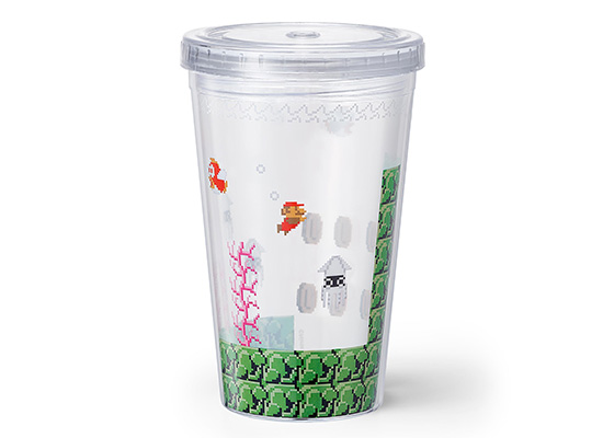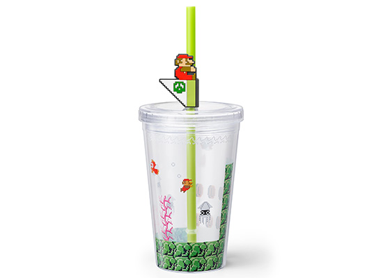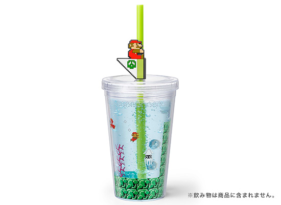 繰り返し洗って使えるストロー付きタンブラーです。透明なタンブラーに飲み物を注ぐと、まるでマリオが水中コースを泳いでいるような見た目に。 マリオのストローマーカー付き。