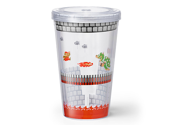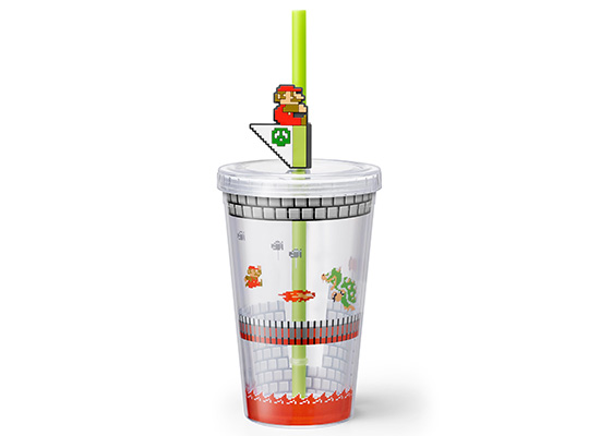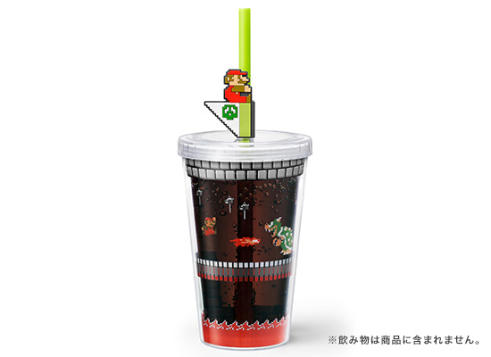 繰り返し洗って使えるストロー付きタンブラーです。透明なタンブラーにマリオとクッパの対決シーンをプリントしています。 マリオのストローマーカー付き。